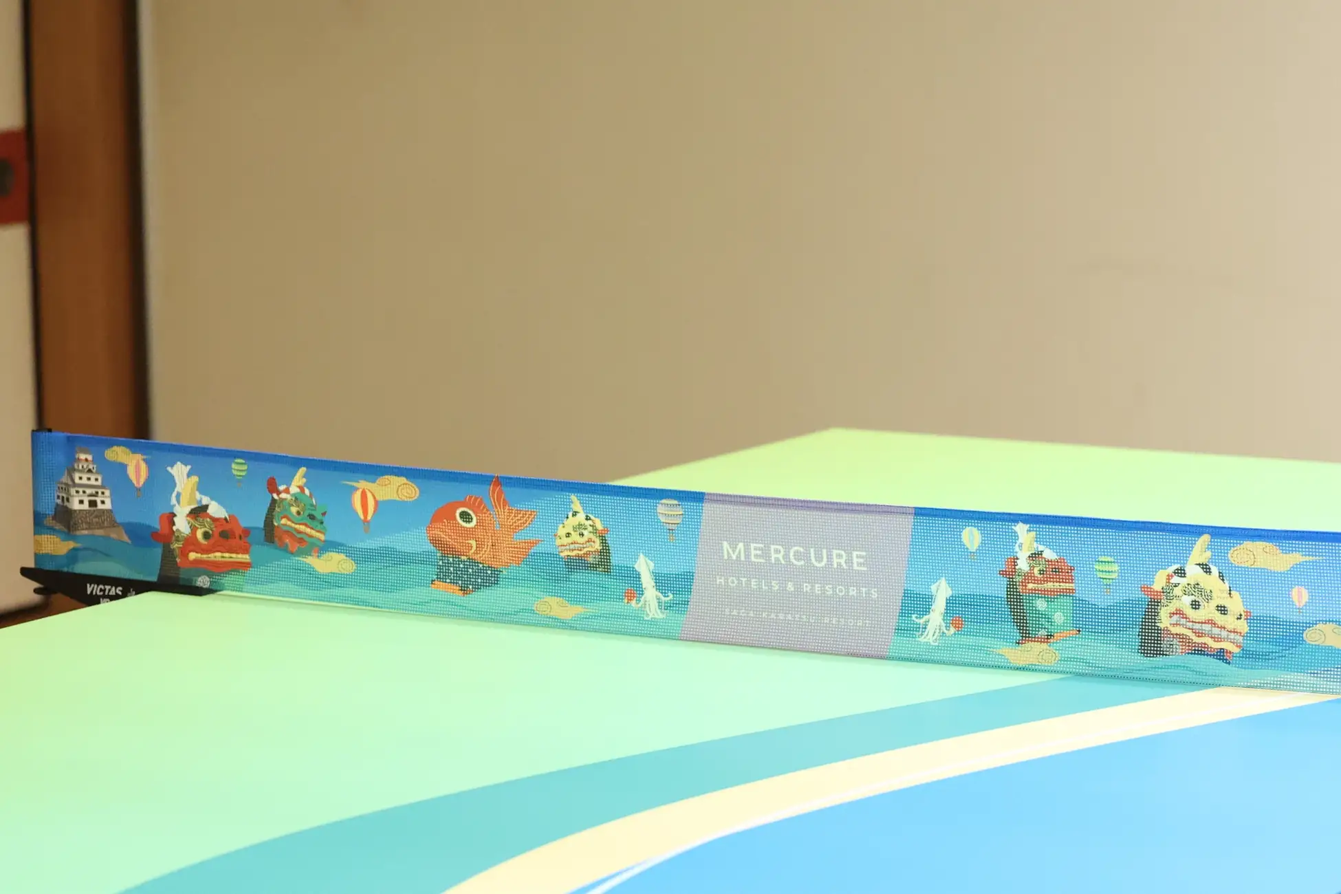 将以往的乒乓球台融入唐津文化和风景的设计焕然一新。桌子面使用了在酒店前面蔓延的日本三大松原之一的特别名胜“虹之松原”的颜色。