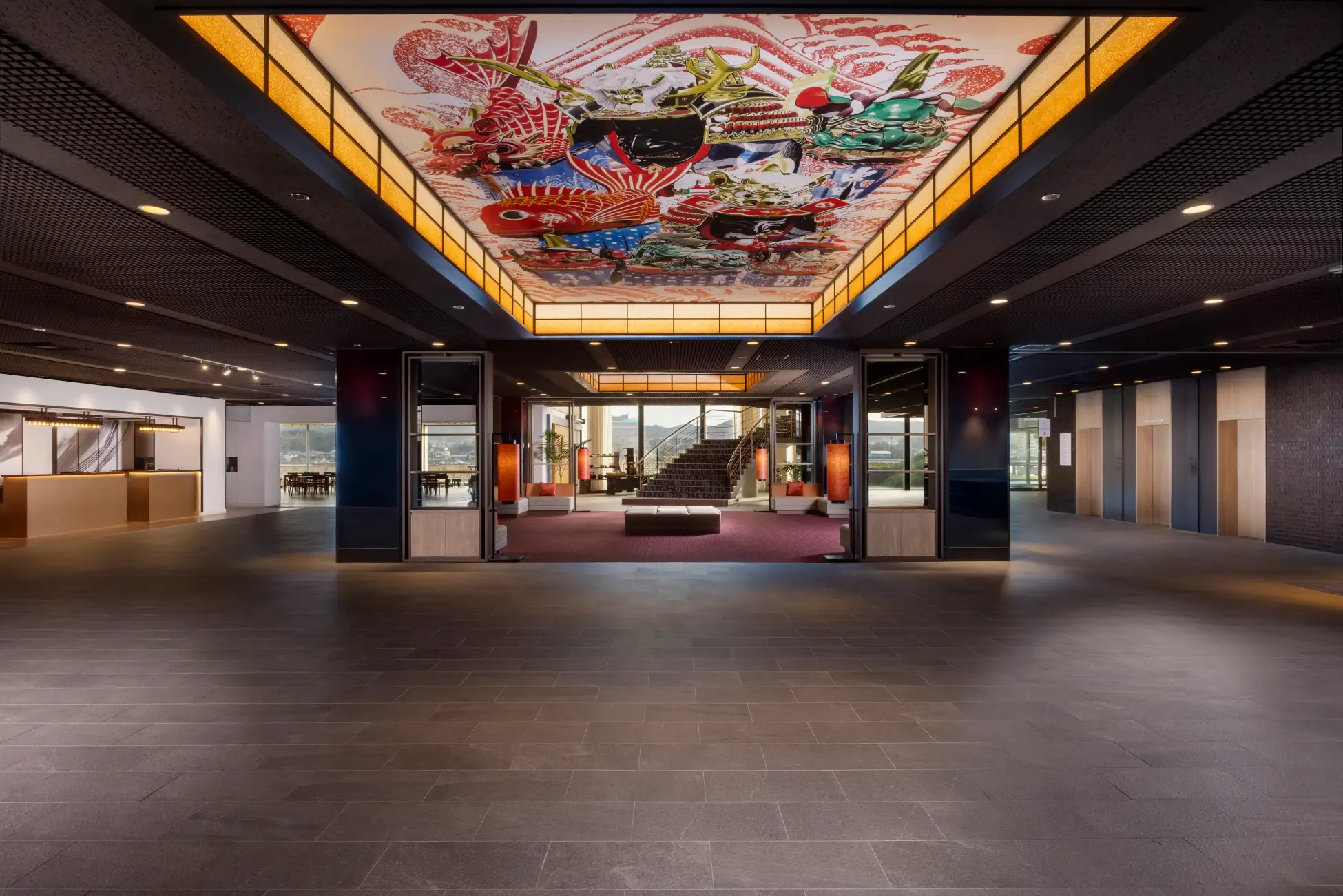 - 以雄壮的唐津君地为主题的大厅天花板。旅行气氛也很高涨