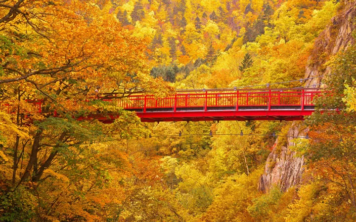 재이하치다케적 지옥악위 원두적 히가시자와 계곡카미, 나가 약 90미적 홍간교, 통칭 "홍색 다리".아키텐 이홍엽적 야악위 배경, 다리적 홍색영 옷저, 작위 소묘 화섭영적 흠정.
