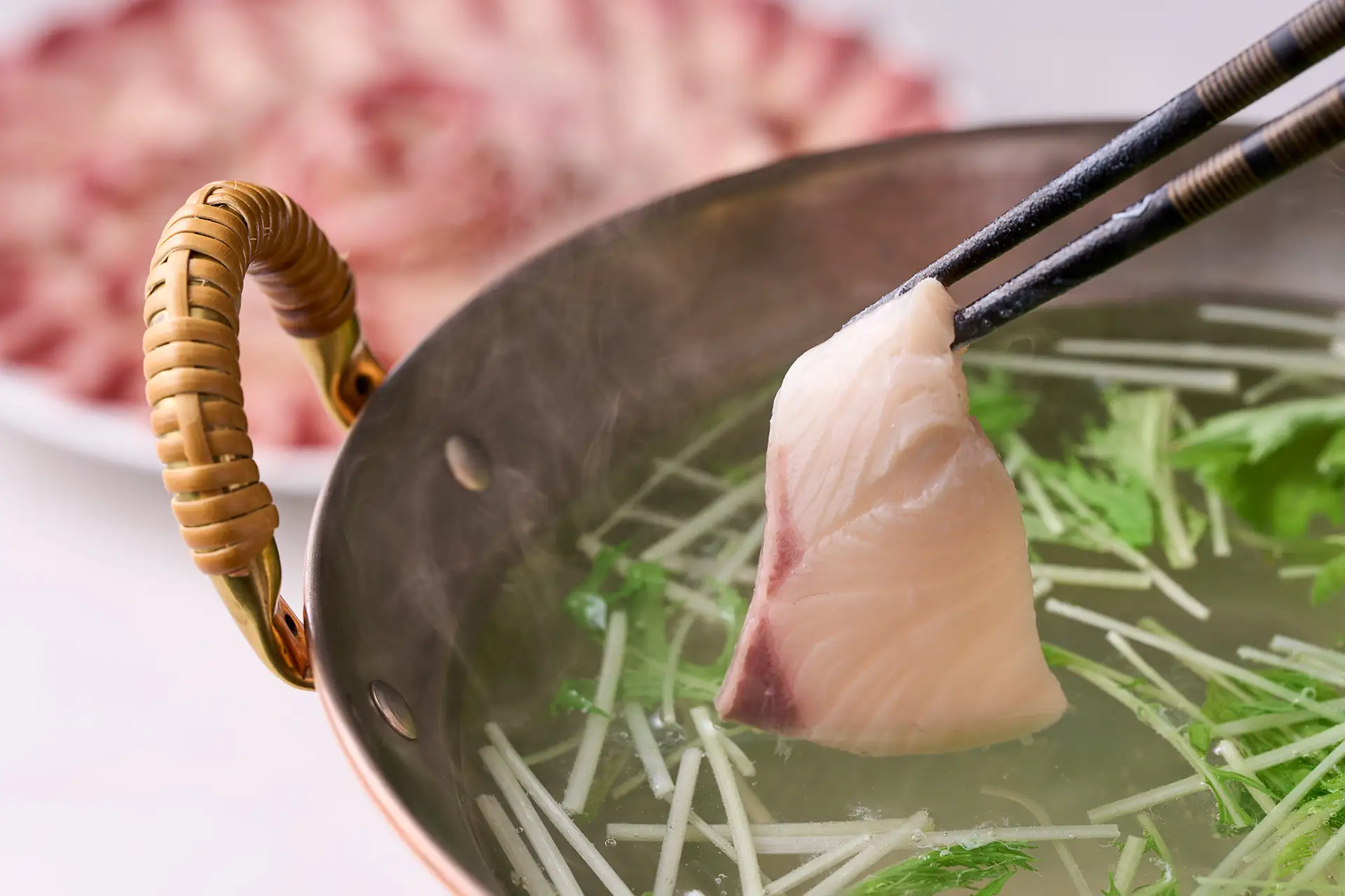 将脂肪超群的时令鰤,用热腾腾的汤汁快速做成了涮锅。含在嘴里的话,美味丰富的脂肪会融化,可以和只有鰤才有的高雅口感一起享受特别的味道。