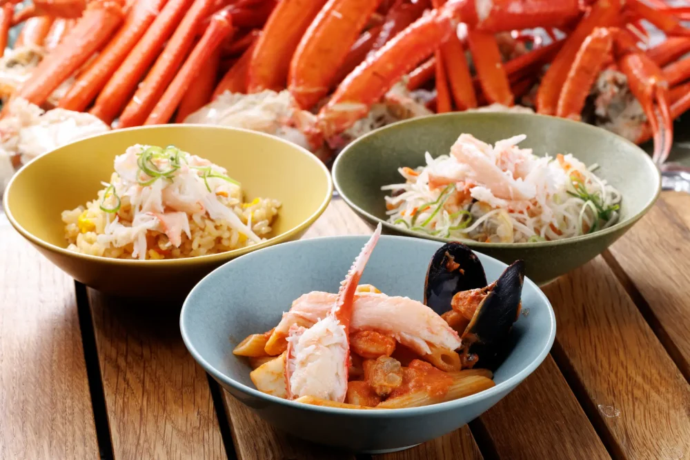 在本计划的销售期间,晚饭可以随便吃到维尼龙虾。另外,将维尼龙蟹的身体装饰在蟹龙虾奶油意大利面上等,尝试编排菜单也是自助餐特有的享受方法。然后在一天的最后,在眺望大山景色的最上层的休息室里,享受当地酒的热酒和热饮,为第二天的滑雪活动提供身心健全的包罗万象寄宿。