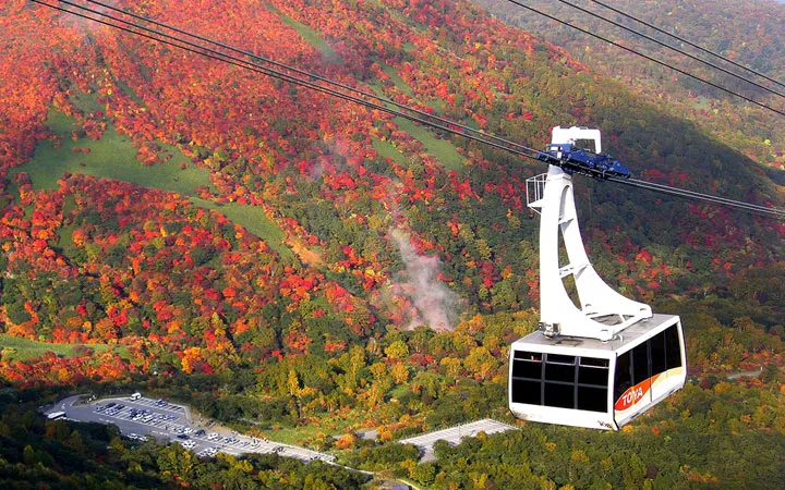고저차 약 800미 급배상승기, 약 10분 종후 도달 쓰루미다케적산상재규슈 최대급별적람차상, 시나카미인 해이이적 홍엽 점변 스트리트.고야마카미가이 조망 벳푸 시가, 벳푸 완와 구중 연산.
