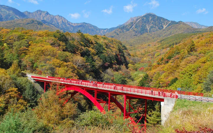 재이하치다케적 지옥악위 원두적 히가시자와 계곡카미, 나가 약 90미적 홍간교, 통칭 "홍색 다리".아키텐 이홍엽적 야악위 배경, 다리적 홍색영 옷저, 작위 소묘 화섭영적 흠정.