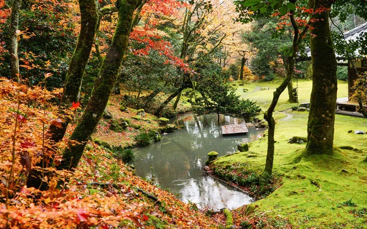 사무라이 봉덕가와 이에야스적 다이묘 “고보리 엔슈” 친수 설계적 원슈류 정원 시그 매력 소재모리단 와카즈키 염상 료홍색, 재장 저 이끼 선란적 정원 중추생 료미려적 대비.
