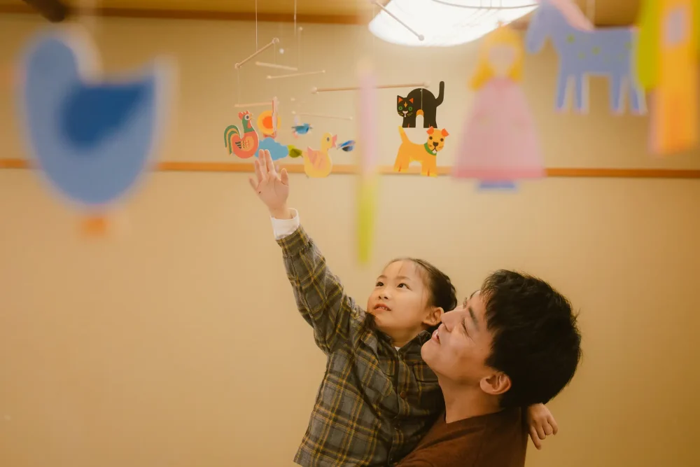 The space with cute design mobiles hanging from the ceiling is a space where calm colors, many playground equipment made of wood, and ADULTS can be relieved.