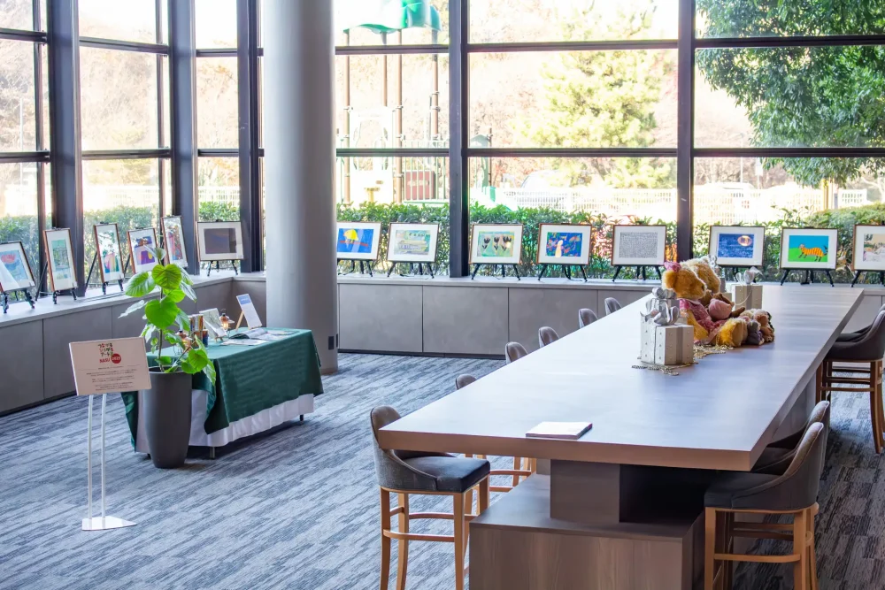 The gallery space set up in the hotel lobby displays works by artists from Nasu, and plays a role as a base for transmitting local culture and art.