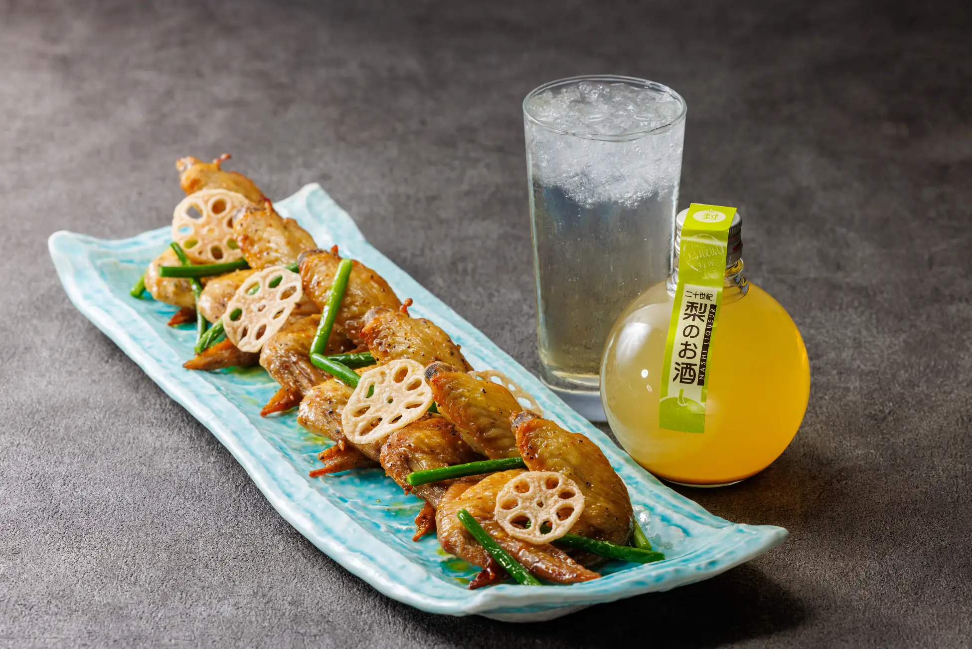 "Earth Herb Chicken®" (*3) is grown at the foot of Oyama with feed containing underground water, which is famous as a famous water, and herbs such as cinnamon and oregano. With the power of herbs, we will pickle and bake the wings of herb chicken®, which have a rich flavor and a rich flavor, in a lemon-flavored spice overnight. The 20th-century pear liqueur wants to enjoy the refreshing flavor and the deliciousness of chicken with a simple menu. It is recommended that you enjoy a liqueur with a good balance of sweetness and sourness, which uses luxurious pear juice from Tottori Prefecture in the 20th century. A pairing of menus and alcohol using the blessings of the earth of Tottori Prefecture will color the memories of your trip.