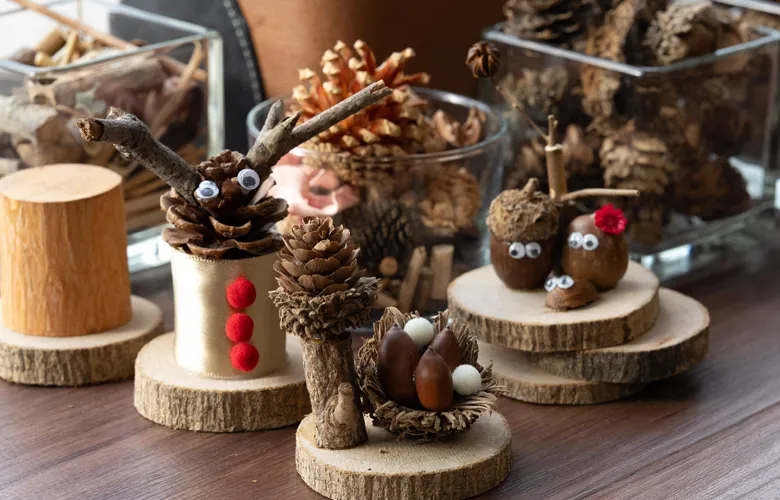 자연 속에 있는 소나무와 도토리 등으로부터 이미지를 부풀려, 그 형태나 소재를 살린 물건을 만드는 네이처 크래프트 체험