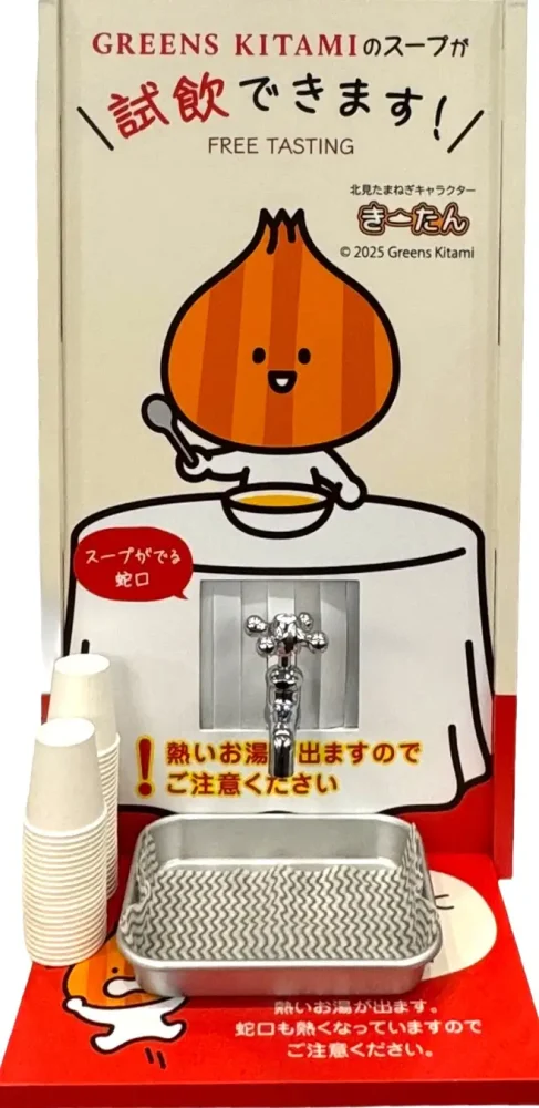 제공하는 스프는 기타미시에 본사를 두고, 홋카이도산 식재료를 사용한 가공 식품 메이커·주식회사 그린즈 기타미의 인기 상품 “홋카이도 어니언 스프”.눈 축제 견학이나 외출에서 돌아온 숙박자를, 온천과 함께 서는 양파수프의 향기와 무심코 발을 멈추는 놀라움의 연출로 따뜻하게 맞이하는, 겨울의 홋카이도 특유의 대접입니다.