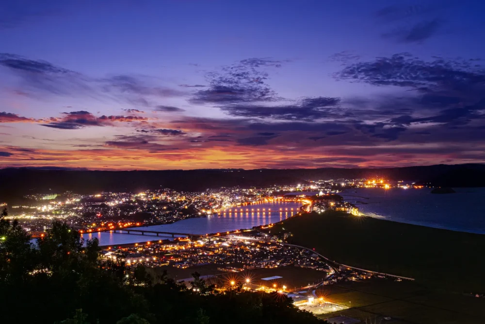 18:00 ‘가미야마 전망대’에서 무지개 마쓰바라와 가라쓰만에 가라앉는 석양을 바라본다