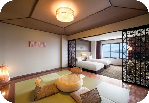 A Japanese-Western style room or suite with a bed and tatami area, you can relax in your own style. We also recommend a kids room where children play the leading role.