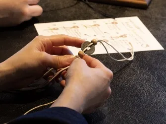北海道平取町のアイヌ伝承工芸館「ウレシパ」とコラボレーションした、アイヌ文様入りペンダント組立体験。
