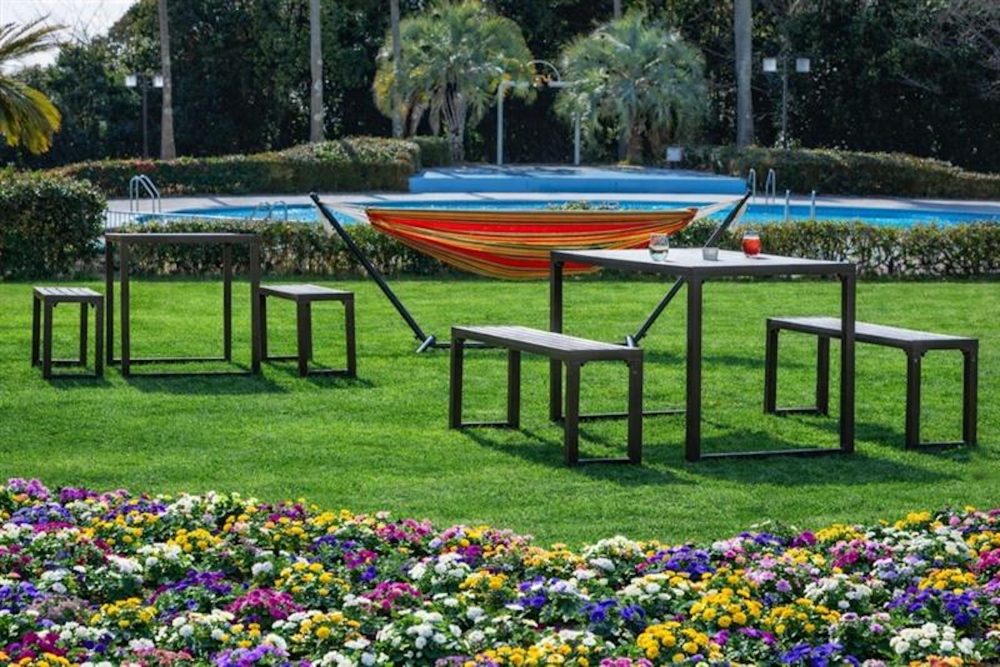 プールを臨むホテルガーデンにて心地よいラウンジタイムを
