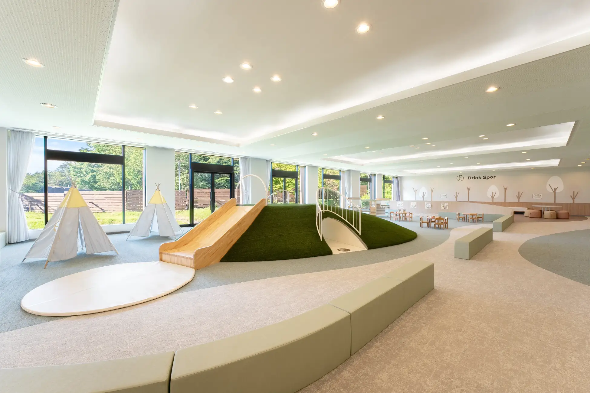 - ドリンクを片手にゲームを楽しむお子さまを見守れる「森のラウンジ」