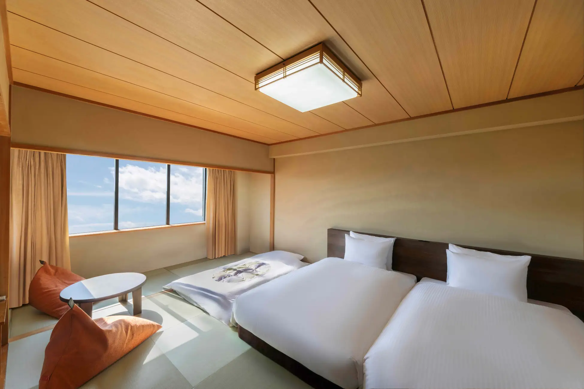 宴会場スペースを有効活用した「森のラウンジ」は広々とした畳敷きの空間から窓の外に富士山を眺める、宿泊者は追加料金無くどなたでも利用できるラウンジです。