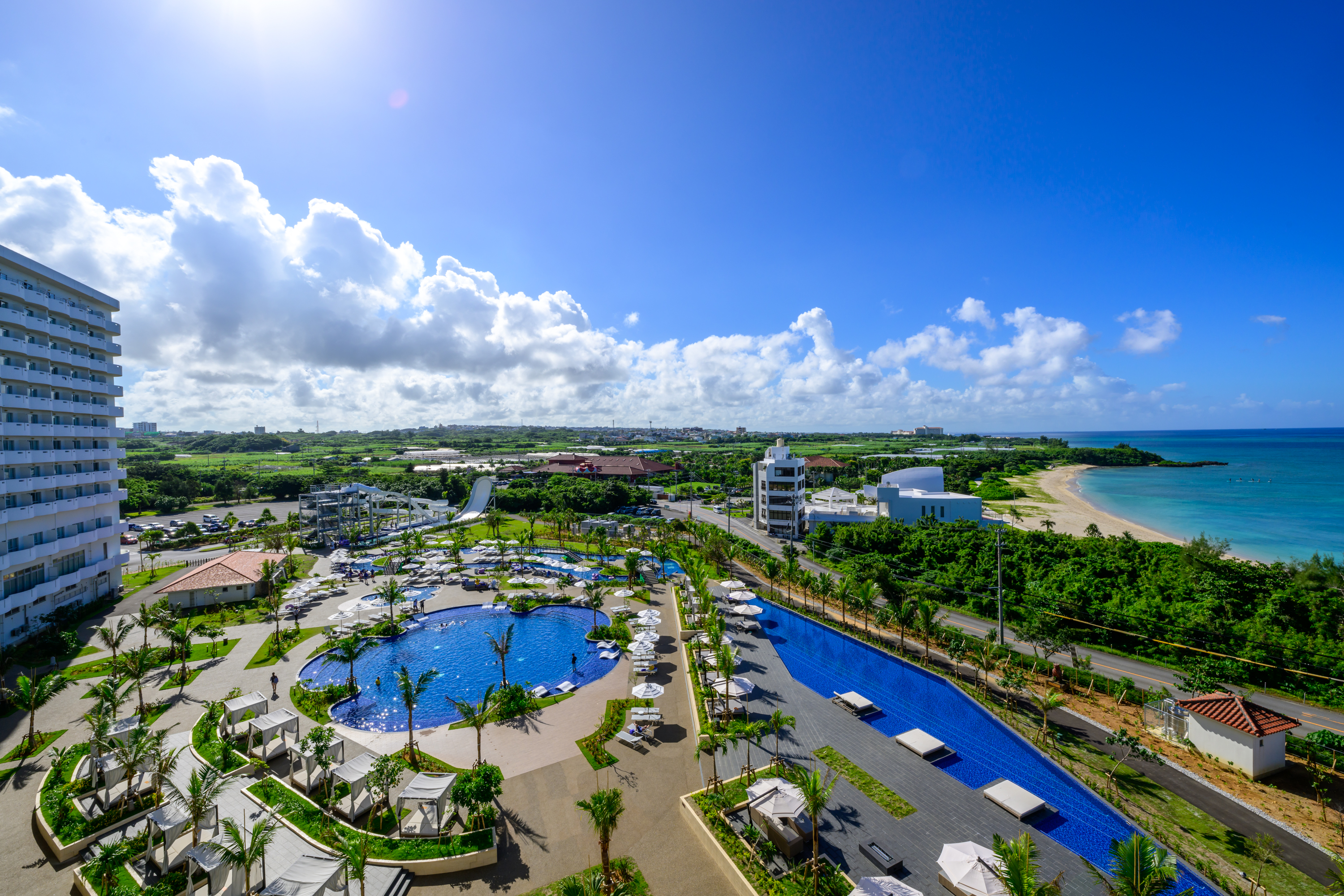 沖縄県内最大級の広さを誇る「オールデイプール」には、4つのプールと3つのウォータースライダーを完備。お子さまと一緒に思いっきりプールを楽しみたいファミリー、プールサイドでゆったりとしたひと時を過ごしたいカップルや女子旅など、様々なニーズに応える充実の施設です。