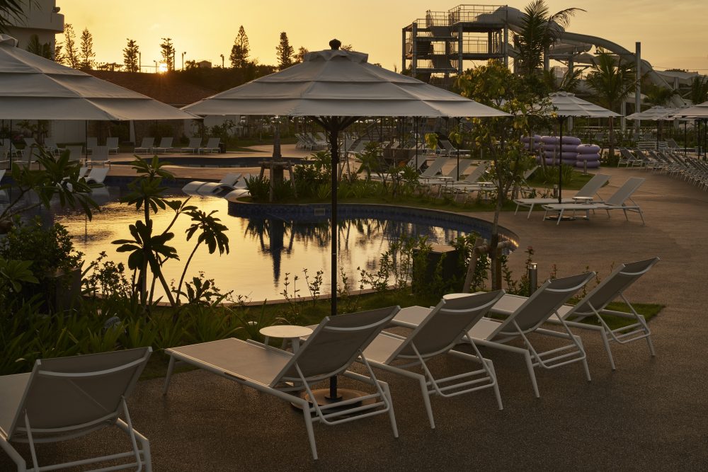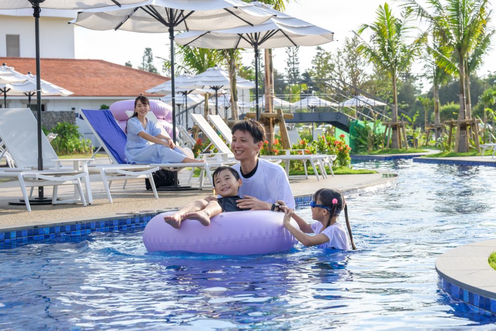 - 「うまんちゅ(=みんな)プール」は水遊びを楽しむお子さまを見守る大人のためにラウンジャーを設置。まさに家族「みんなの」プール