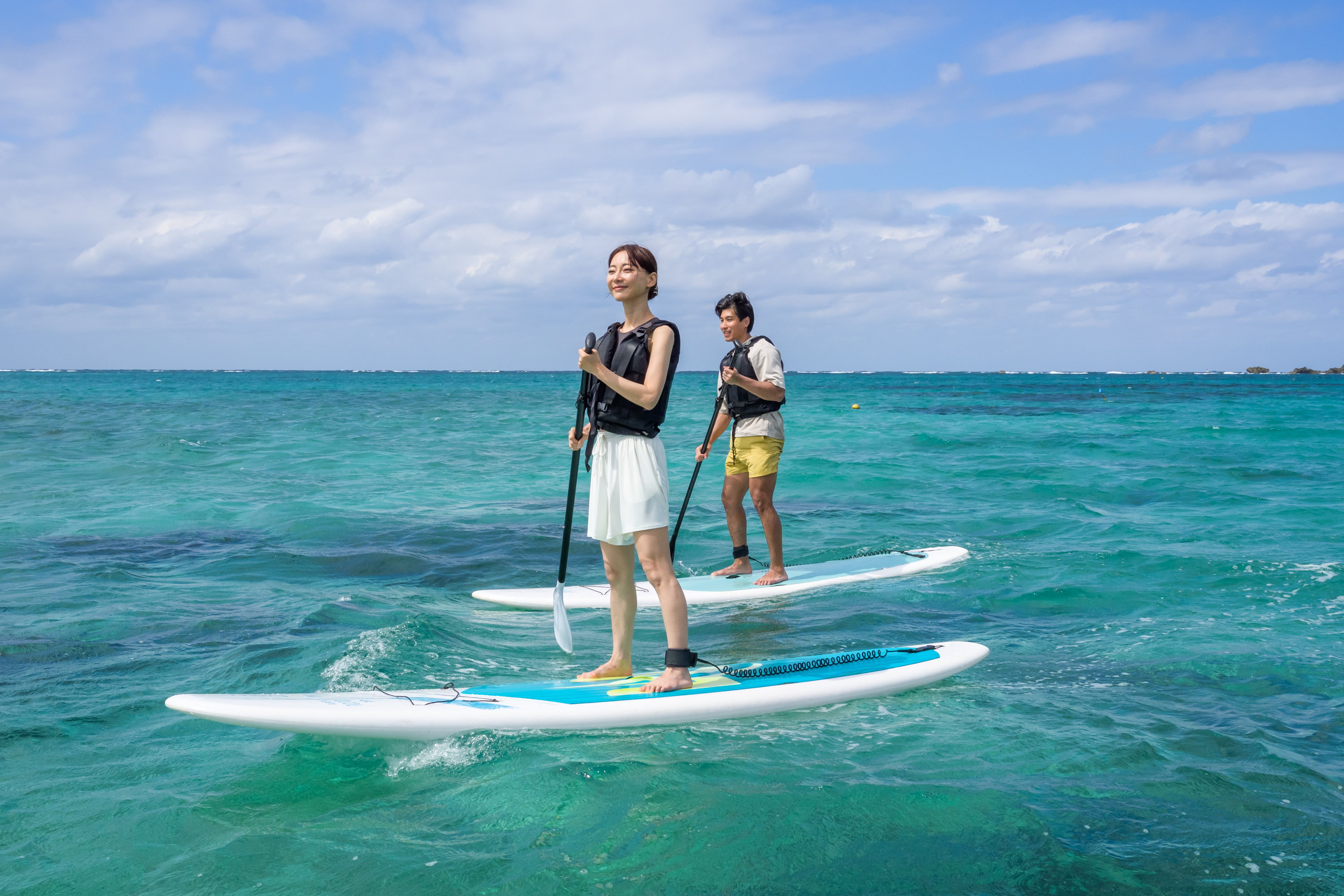 - 透明度抜群の残波の海。風を切って走る爽快感を味わう「スタンドアップパドルボート」