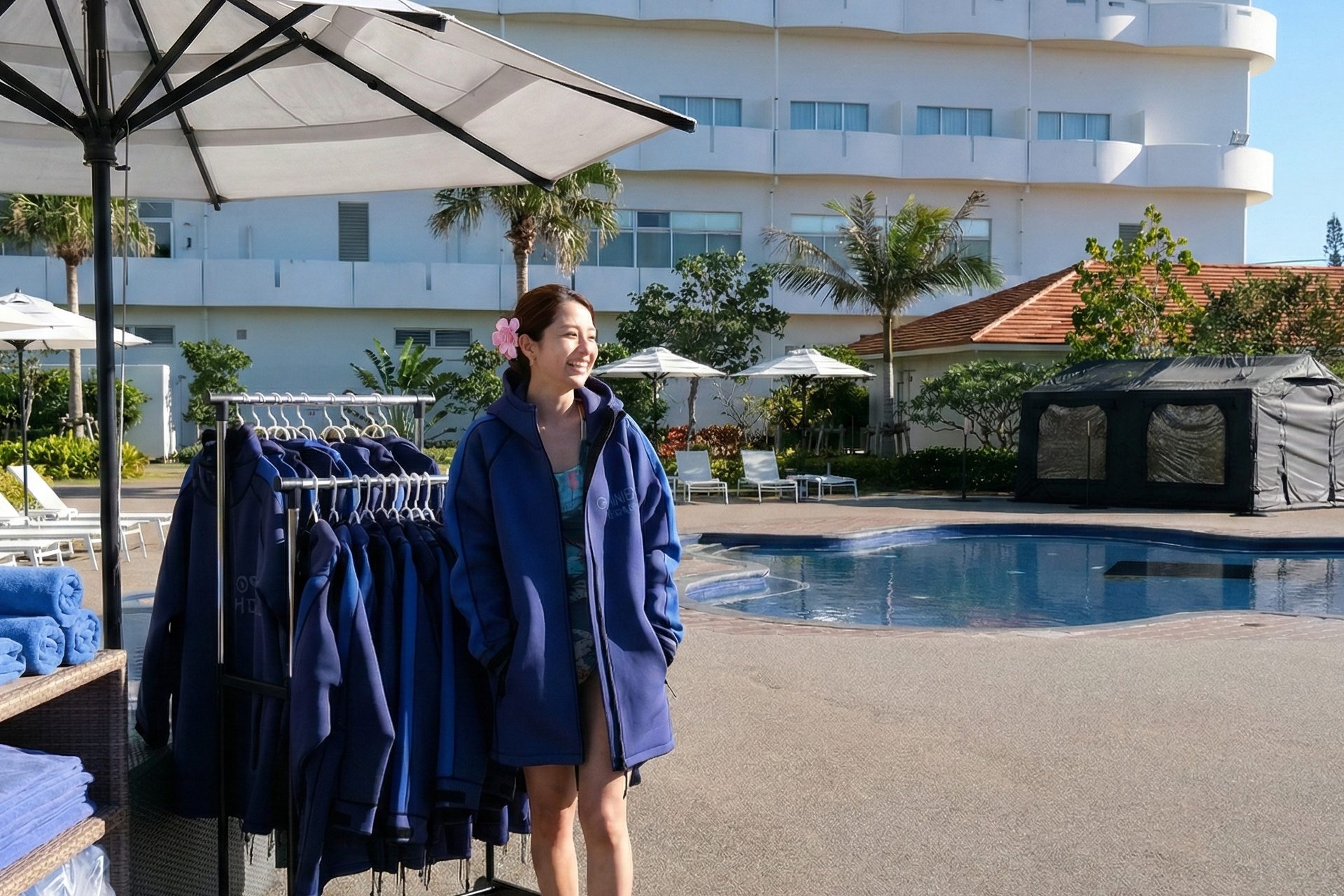 - プールに入って冷えた身体を温める「ホットエリアテント」をプールサイドに設置。ボートコートの貸し出しも無料