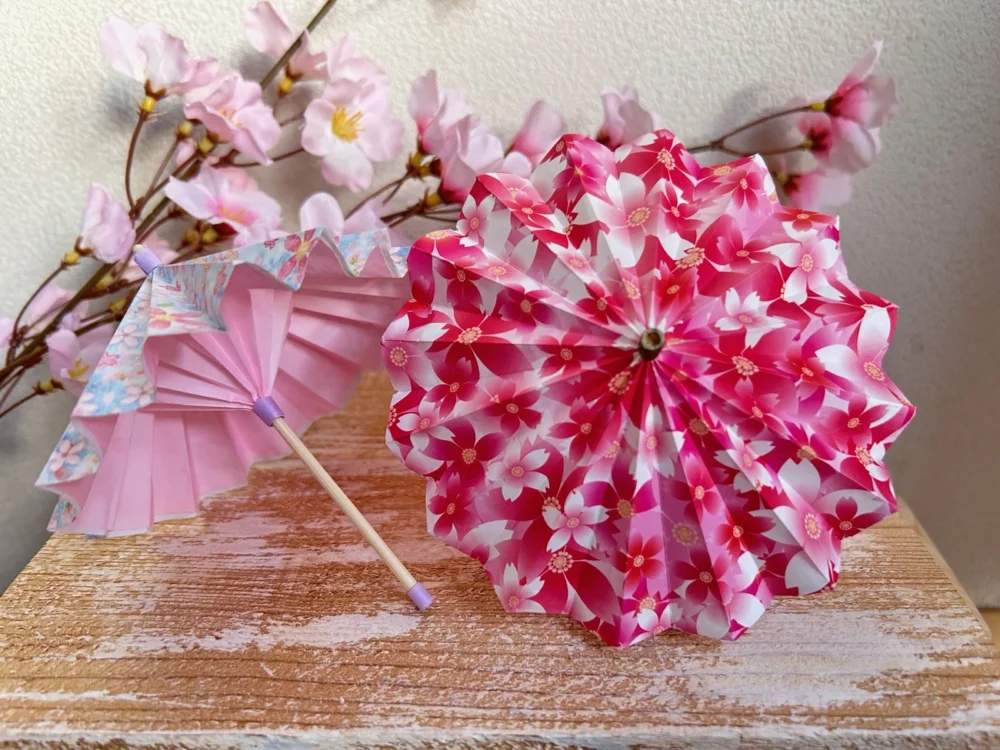 - さくら柄の折り紙で作る春色あふれる和傘
