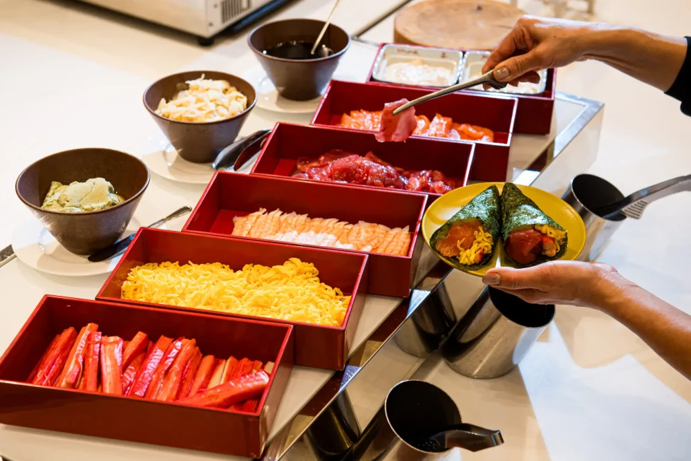 フレッシュなサラダや和洋の豊富なメニュー、デザートまで50種類以上のメニューが並びます。まぐろや海老などの具材を選んで作る手巻き寿司、小ぶりなバンズにビーフパティやチーズ、野菜を挟むハンバーガー、テーブル上で調理し熱々に仕上げた肉を楽しむ陶板焼きなど、お客さま自身でカスタマイズできるメニューを用意。美味しいことはもちろん、同じメニューでも盛り付けや具材の組み合わせによって見た目や味も異なり、「次はそれを食べてみようかな」と会話も弾みます。