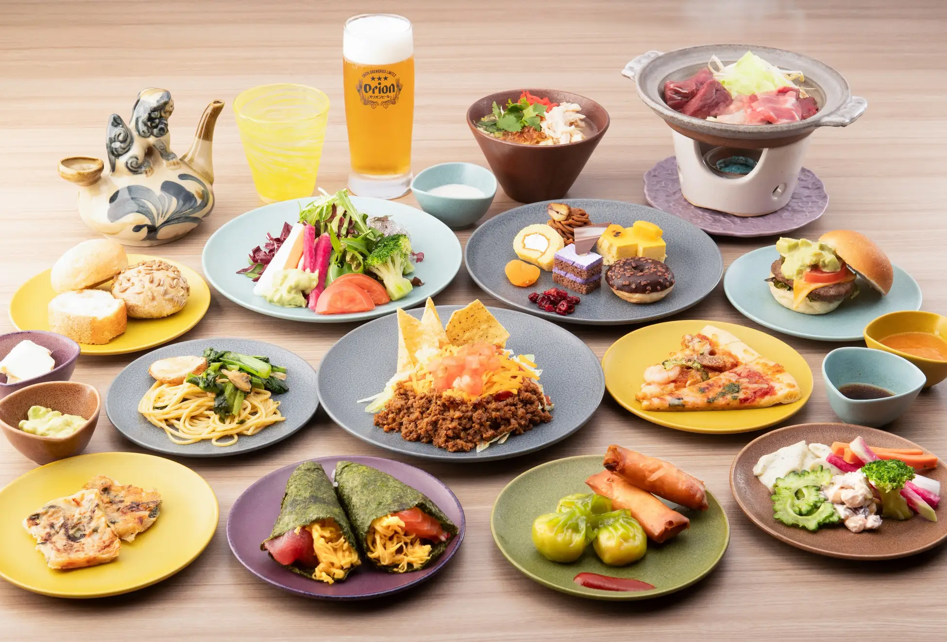 好きな具材を選んで作る手巻き寿司やハンバーガー、熱々に仕上げた肉を楽しめる陶板焼きなど、好みでアレンジできる多彩なメニューを用意しています。加えて、オリオンビールや泡盛などのアルコールを含むドリンクも料金内で楽しめるのが特徴です。