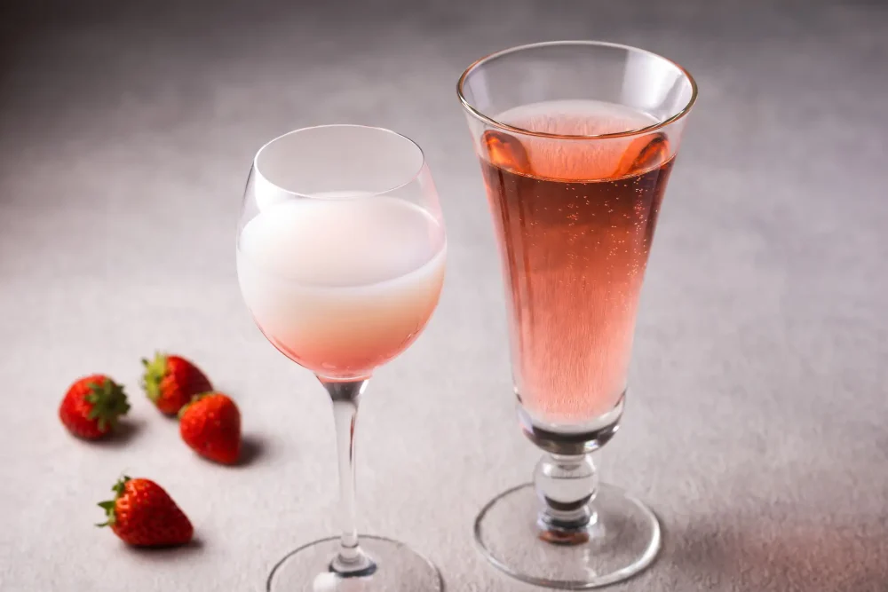 いちごの甘酸っぱさとみずみずしさ、ビターなチョコレートのマリアージュにスパークリングワインが華を添える。