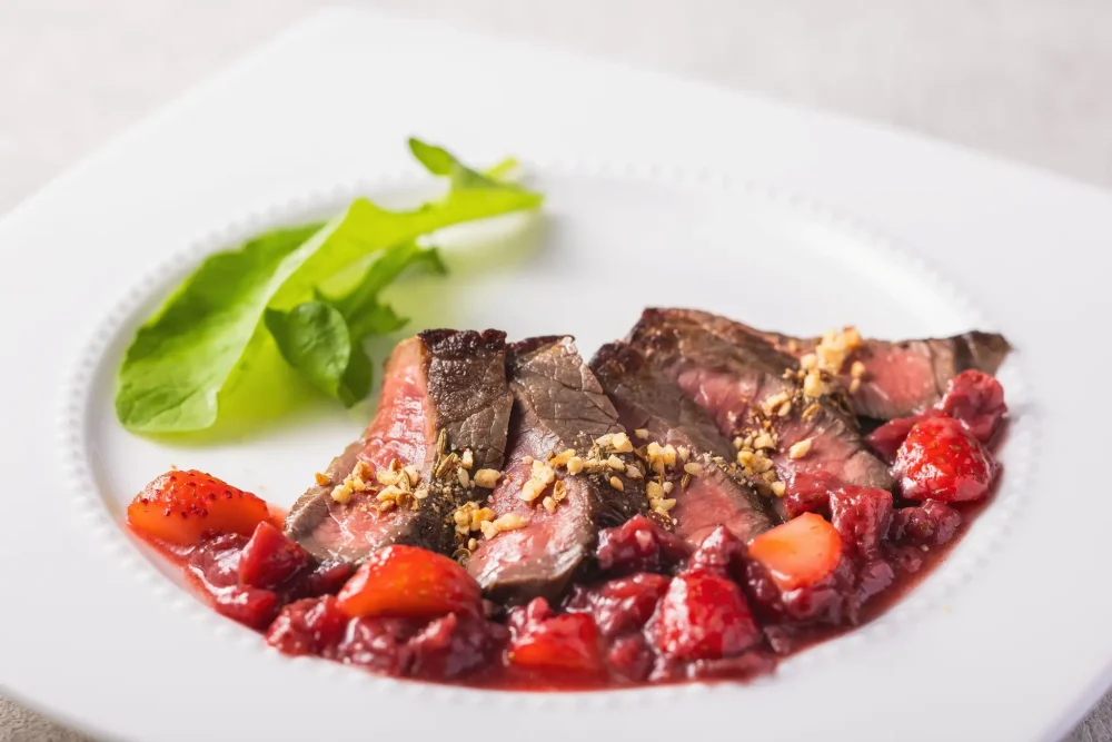 シェフがお客様の目の前で調理し、出来立ての美味しさを提供する人気のライブキッチン。当ホテルでは、地元ブランド牛の「むなかた牛」を焼きたてで提供します。通常5種類のソースを用意していますが、期間中は牛肉の旨味を引き立てる赤ワインをベースにした、甘酸っぱいいちごソースとのマリアージュも楽しめます。