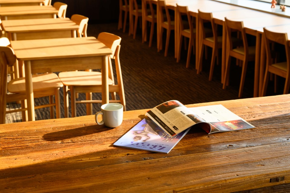 在休息室中央,作為空間的象徵,配置了長年被重視使用的古道具的桌子。此外,飯店工作人員還設置了收集橿原飛鳥地區歷史和文化相關書籍的書架,實施了停留期間的一段時間自然與地域的關心相關聯的裝置。
