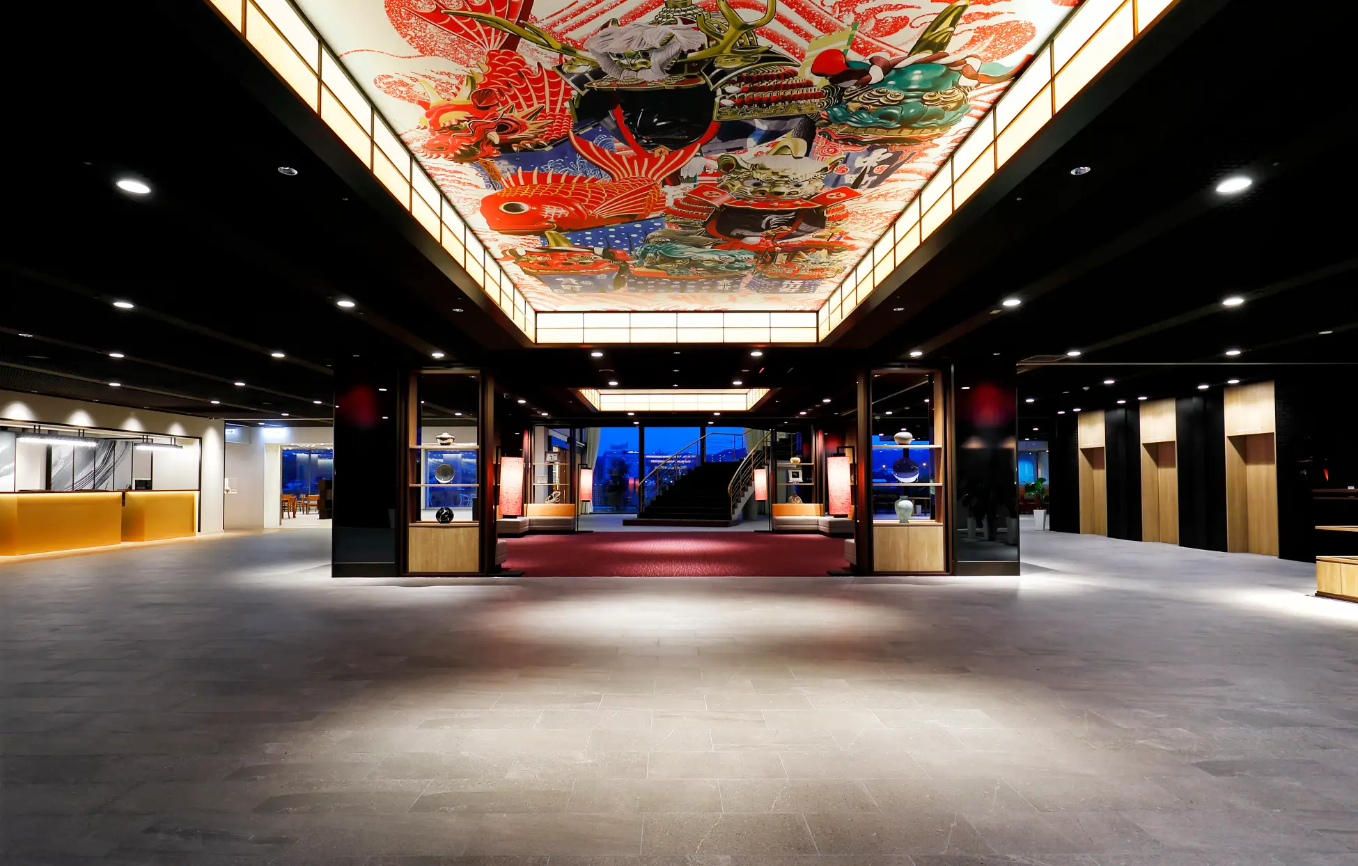 - 以雄壯的唐津君地為主題的大廳天花板。旅行氣氛也很高漲